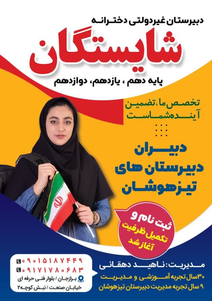 دبیرستان غیر دولتی شایستگان دوره دوم دانش آموز موفق 0 ساعت مشاوره تحصیلی 0 خدمت متنوع تحصیلی 0 درباره ما بیشتر بدانید ... ناهید دهقانی موسس و مدیر دبیرستان غیردولتی شایستگان30 سال سابقه آموزشی و مدیریت9 سال سابقه مدیریت دبیرستان استعدادهای درخشان فرزانگان برازجان دوره دومکارشناس ارشد روان شناسی